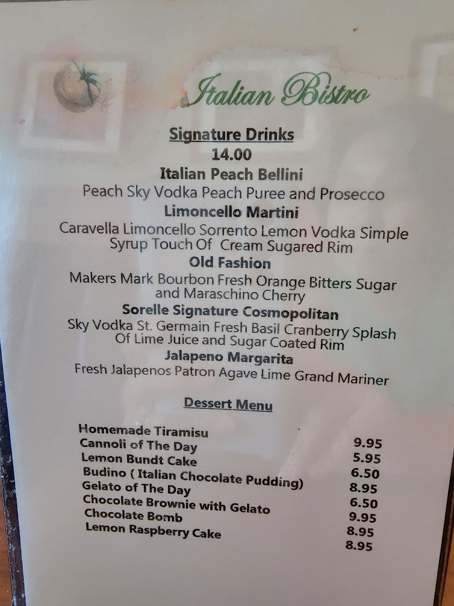 But it doesn’t stop at the main course. Desserts here are where Sorelle truly shines! From the rich Homemade Tiramisu to the delightful Cannoli of the Day, each sweet treat is a testament to the bistro's commitment to authentic flavors. The Chocolate Brownie with Gelato is a must-try for anyone looking to end their meal on a high note, combining depth of chocolate flavor with creamy gelato bliss.